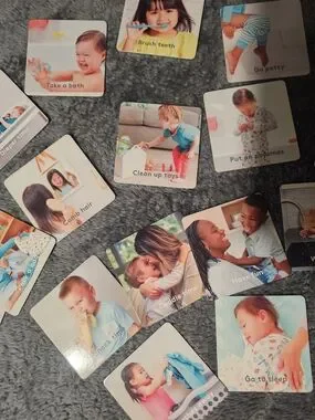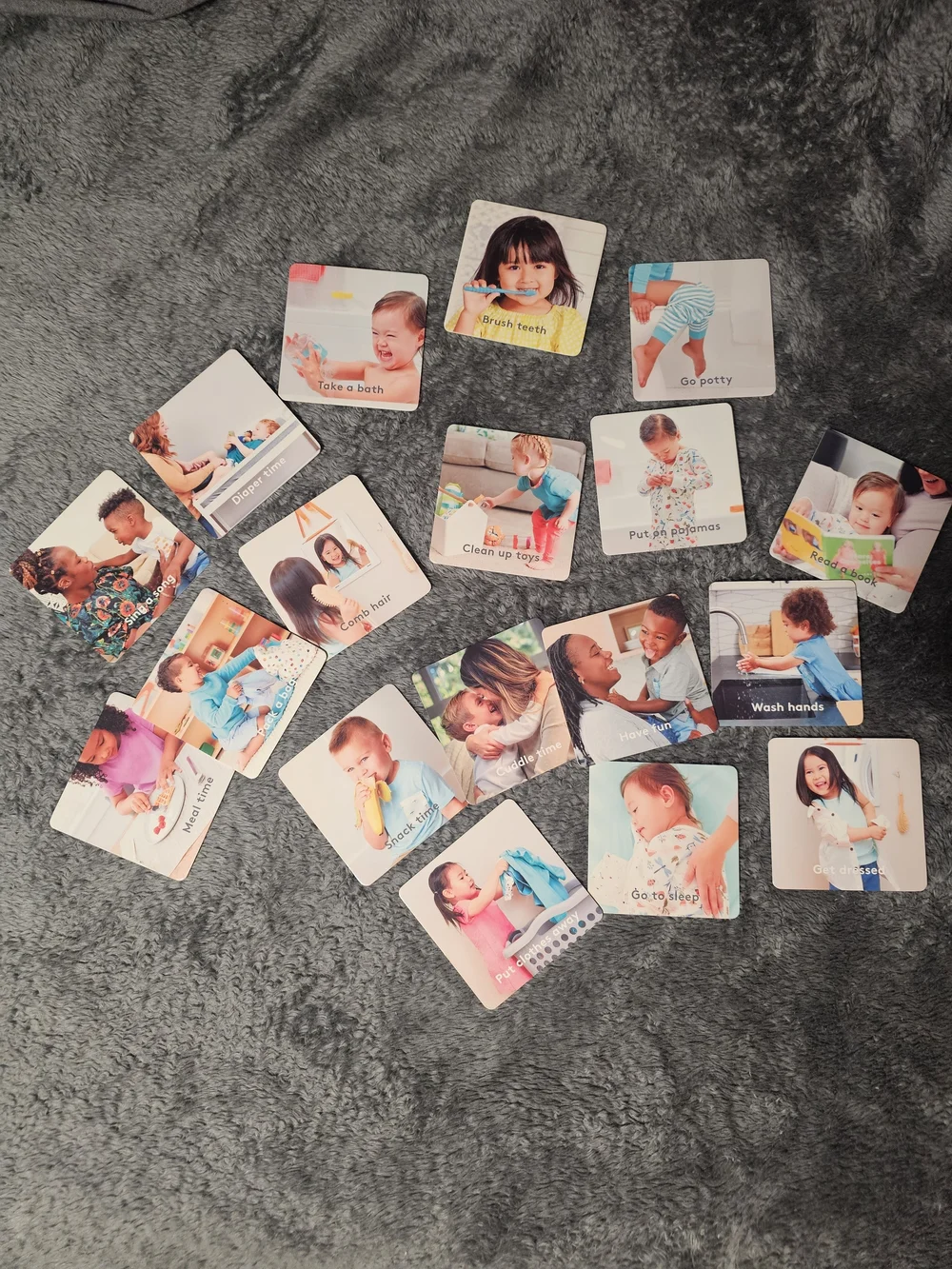 Set of kid-friendly routine cards featuring bright multi-color photos. Helps children learn everyday tasks with simple, visual prompts. Durable photo cards for easy everyday use and practice. Includes colorful imagery to engage young learners.