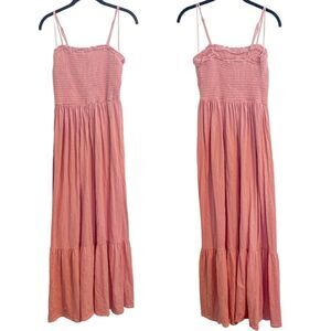 Features: sleeveless, thin adjustable shoulder straps, smocked bodice, flounced hem, pullover style, maxi length, unlined, pink