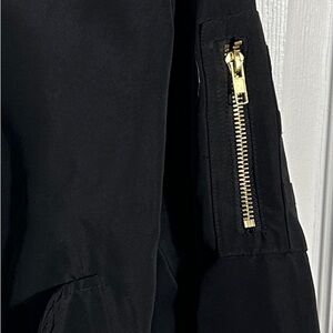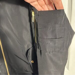 Dailylook black bomber jacket with a pink lining. Size small, with 2 false front pockets, functional arm zip pocket and open pocket. Rib knit cuffs and hem, rib knit collar. Gold zipper.