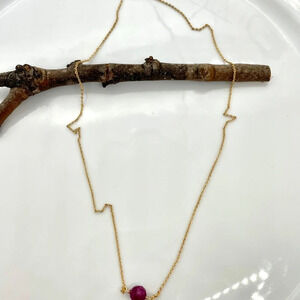 Very dainty gold plated chain with a 6mm raw ruby bead wired to the chain. The ruby is a beautiful dark fuchsia color. There is very slight damage in the clasp area. The clasp works perfectly.