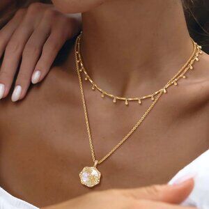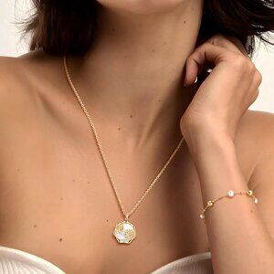 Dainty 18K gold plated necklace with Mother of Pearl — a subtle yet meaningful accessory.