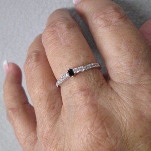 Dainty 925 sterling silver black diamond ring with sparkling simulated diamonds. Well made and so adorable. The tiny lab black diamond measures 4mm long, surrounded by the sparkle of tiny cz's. Various sizes available in the dropdown. Stamped 925.