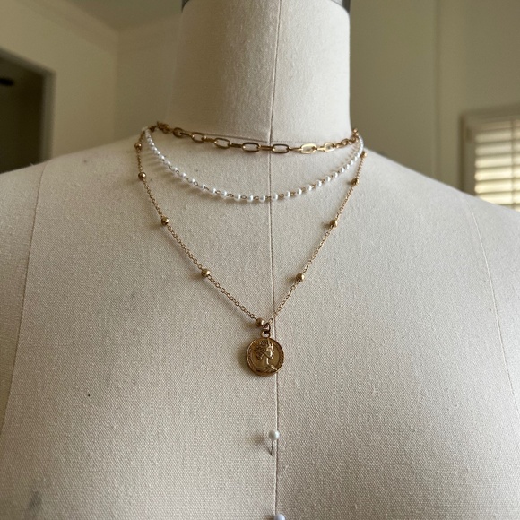 This necklace features gold layered chains adorned with pearl strand gold beaded strand. Pretty Y shape with medallion pendant.