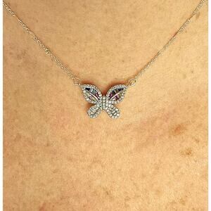 Very feminine stunning butterfly necklace. The silver-plated butterfly charm connector is adorned with colorful CZ accents. Unique rainbow cubic zirconia baguettes and round. 16 inch Sterling silver chain, clasp and 2 inch extender.