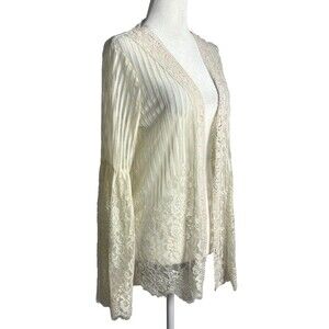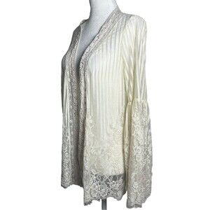 This dainty and delicate top from Xhilaration is perfect for those who love the fairy world. The ivory color, striped pattern, and embroidered accents make it a perfect addition to any bohemian or hippie themed outfit. The long bell sleeves and open lace fabric add a touch of femininity, while the fringe detailing give it a classic and elegant look.