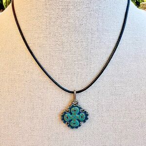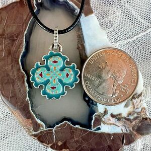 Lovely little Maltese cross pendant charm - a classic motif by Lucky Brand. Done in 2 shades of turquoise with red and yellow/orange accents on one side, the opposite side is patina'd silver tone - looks a bit like pewter with the Maltese Cross in raised relief. Super cool to wear either way.