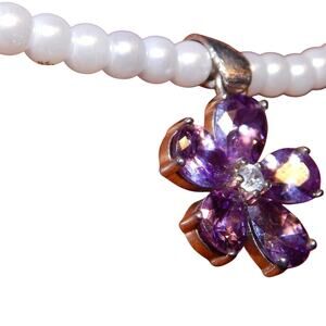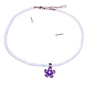 This is a beautiful and dainty faux pearl necklace and earring set. The necklace features a delicate faux pearl chain with a stunning purple rhinestone flower pendant. Creating a cohesive and elegant look.