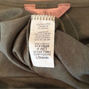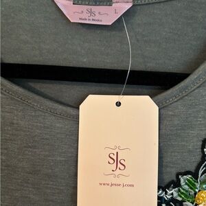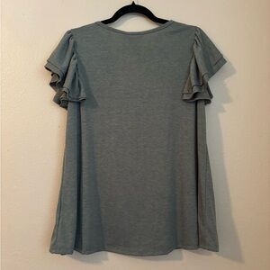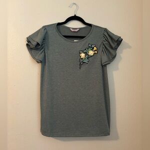 Super cute & feminine top Olive Green with Yellow Flower embellishment on left Size L Dainty Ruffle cap sleeves NWT Excellent condition