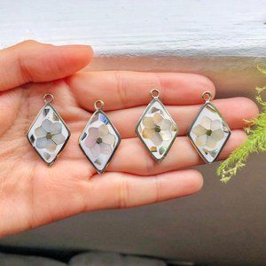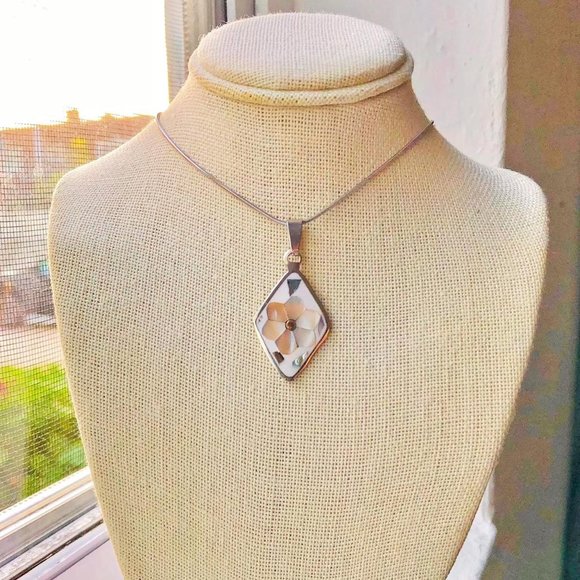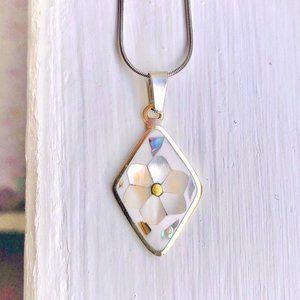 Beautiful small diamond shaped alpaca silver pendant (approx. 1” long) with confetti pieces & a cream flower abalone shell inlay on a white enamel resin background. Hung on a stainless steel snake chain with lobster clasp.