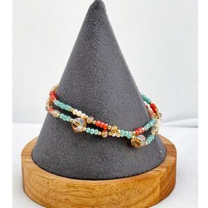 dainty bracelet with iridescent glass beads in colors of cream, coral and teal with larger beads of champagne color. In great condition with a good stretch to them. Theyre adjustable so would fit most wrists.