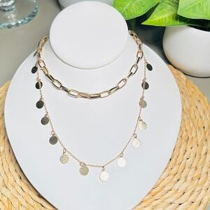 Dainty Gold Layering Necklace, Two-Layer Gold Disc Circle Charm Necklace, Gold Paperclip Necklace, Layered Gold Plated connected Set