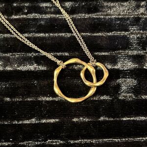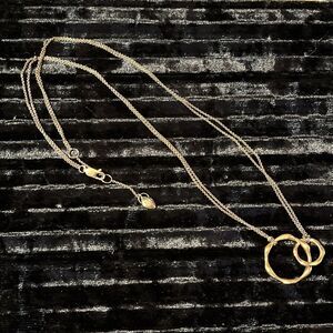 This dainty gold plated vermeil .925 sterling necklace features interlocking hexagon pendants, making it a timeless and elegant accessory. The lobster closure ensures secure wear, while the minimalist design is perfect for everyday wear or special occasions like engagements, weddings, or birthdays. Signed by the brand M, this necklace is a classic and elegant piece that will beautifully complement any outfit.
