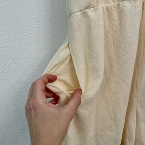 Dainty Hooligan Women Tide Rope Ivory Romper Open Back Halter Size Medium New. Open back Romper in a cream color. Both outer and lining material = 100% polyester. No zippers. Only clips around back of neck to fasten the garment. See picture for details. Size medium. Loose fit. Armpit to armpit = 19.5”. Material very stretchy. Brand new with tags.