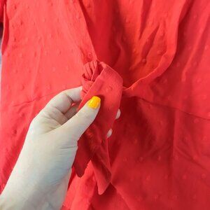 THEME/STYLE: Closet Staple, Everyday Wear, Sustainable Style, Weekend Casual, Elevated Basics, Workwear Staple, Ruffle sleeve, keyhole back, tie front, textured, lightweight, romantic, coquette, date night, spring, summer, casual, feminine, soft fabric, vibrant red, whimsical, flattering fit, everyday wear,Dainty Hooligan