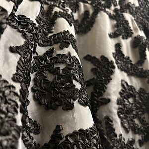 Elegant high low dress with floral lace overlay. Perfect for formal occasions. Features a sophisticated design.