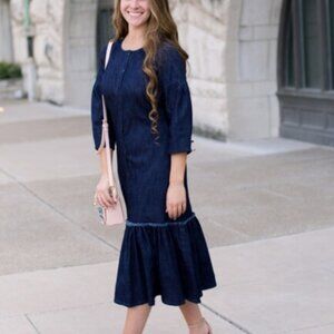 The name says it all, this is the most darling denim dress we ever did design! Simple but so sweet with the button front and ruffle trim detail. The perfect dark wash that works for all seasons. A flattering fit for ladies of every age and stage of life. Just as adorable with sneakers and sunnies as it is with boots and a beret. This will easily be in your regular rotation! 3/4 length sleeves.