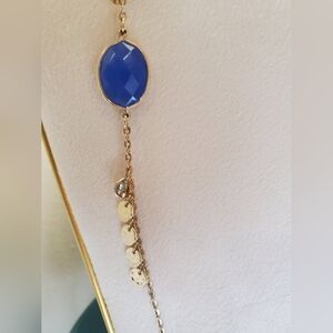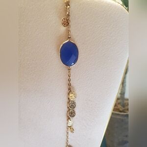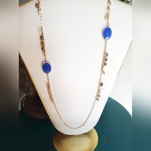 Beautiful long, dainty statement necklace, blue and gold with hammered coin fringe. Complete your outfit and dress it up!
