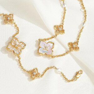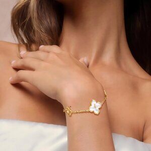 Features: This unique bracelet features a charming 14K gold-plated brass design with a beautiful four-leaf clover pendant on each side—wear it front or back for different looks. The delicate pearl accents add a touch of sophistication, while the sturdy lobster claw clasp keeps it secure. Perfect for stacking or wearing alone to elevate any outfit.