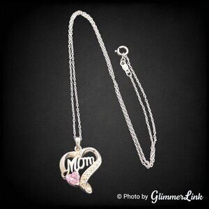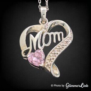 Sterling silver pendant necklace featuring a heart shaped pendant with "Mom" lovingly displayed and a pink cubic zirconia crystal on a cable chain.