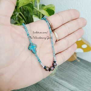 Glass seed beads, plated hematite gemstone beads featuring a cross