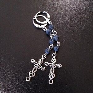 This pair of earrings features 3 small, frosted black Agate Beads in a Rosary Chain Style - ending in a silver-tone cross with embellished Celtic Knot designs. I used round leverback earring wires. App 2.5" long from top to bottom.