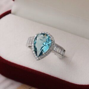 🌸Dainty Sea Blue Water Drop Crystal Pure CZ Silver Pear Ring for Women, K916