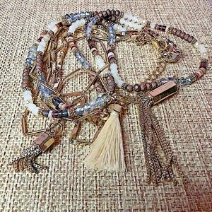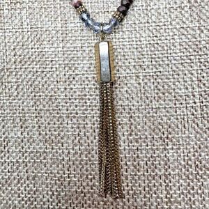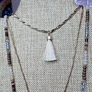 Dainty Triple-Strand Necklace With Tassels: Gold, Shades Of Brown, Blue, Ivory