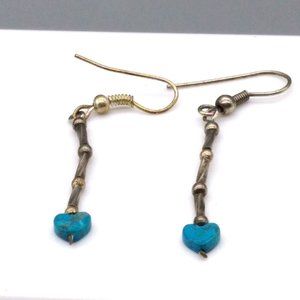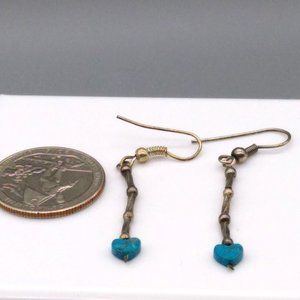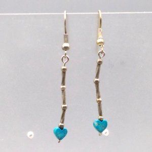 Dainty Vintage Heart Drop Earrings, Silver Tone Tubes and Beads end in Tiny Turquoise Stone Heart