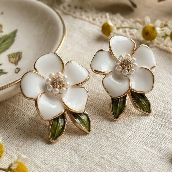 White flower earrings, vintage-inspired earrings, dainty earrings, floral earrings, faux pearl earrings, rhinestone accent earrings, hypoallergenic earrings, 925 silver post earrings, flower stud earrings, elegant earrings, timeless jewelry, lightweight earrings, gift for her, statement earrings, trendy earrings, alloy earrings, green leaf detail earrings, boho chic earrings, unique earrings, fashion earrings, women’s accessories, classic earrings, everyday wear earrings, wedding jewelry, bridesmaid earrings, floral statement studs