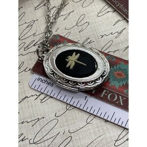 This dainty cameo dragonfly locket necklace is a handmade piece from the Fancy Fox Boutique. The oval resin cameo pendant features a multicolor design with a dragonfly motif, making it a unique and meaningful gift for occasions like Easter, weddings, birthdays, and more. The silver-plated chain is 24 inches in length and comes with a lobster closure. Perfect for nature and animal lovers, this charming necklace adds a touch of bohemian style to any outfit, making it a versatile accessory for everyday wear or special events.