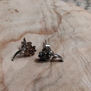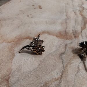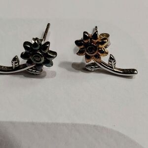 Silver-tone metal is designed in a dainty flower style. One flower is orange like a sunflower, and the other is a dark flower—perfect accessory for any witch needing soft elements to style themselves. The flower resembles a sunflower, but judge for yourself!
