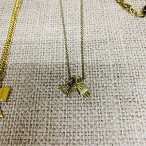 Goldtone Ships Wheel 18 in, July Birthstone Bow Goldtone 17 in, Goldtone tiny charms 18 in, VTG black glass Goldtone choker 14 in, Avon Goldtone tear drop 34 in.