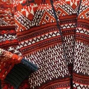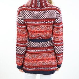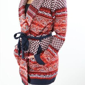 Heavyweight, relaxed fit tie-waist cardigan with long sleeves, front pockets, festive tribal pattern and mohair detail for added softness. Pairs great with skinny jeans and boots.