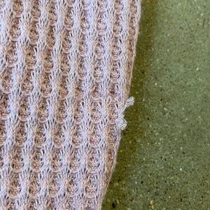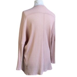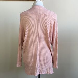 Pale rose colored open thermal cardigan with 3/4 sleeves. The material is very thin and lightweight. There are a few pulls in the fabric, but this top is in good overall condition.