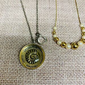 Gold tone affirmation nautilus 20 in, Goldtone faux pearl and gold tone beads 16 in, Cheekys Gold tone druzy sunflower 21 in, silver tone crystal drop 17 in.