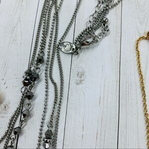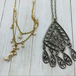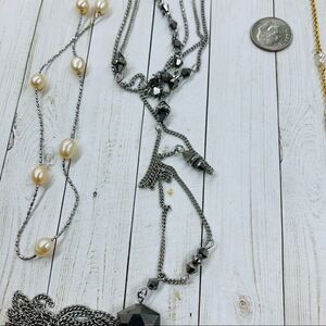 Pearl 18K Gold plate 16 in, Charming Charlie Silvertone Black Crystals Layered 24 in., Goldtone layered pearl 16 in, Silvertone Filigree Dangles 30 in, Lauren Conrad Gold Links 18 in.