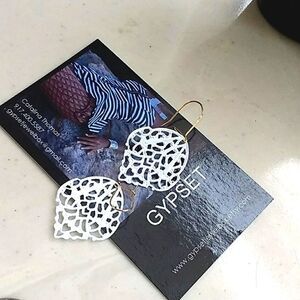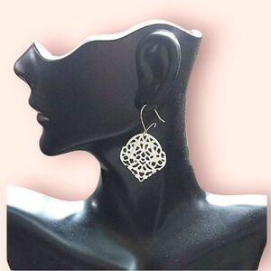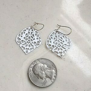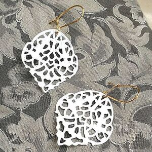 From Etsy, lightweight, delicate lacey white metal earrings with gold wires.