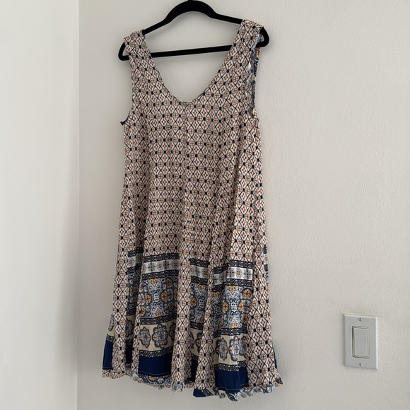 Perfect sundress. Light weight and flowy. Print reminds me of Mediterranean tiles. Looks very summery! Great for vacation and casual events. Colors are blue, white, yellow, and orange.