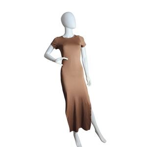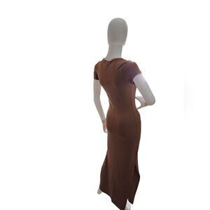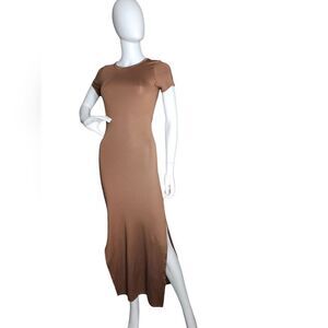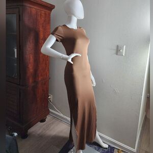 This elegant brown maxi dress offers a sleek and sophisticated look. Perfect for any occasion, it combines comfort with style.