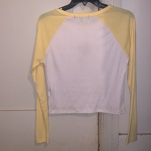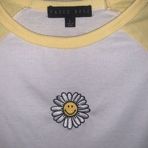 Cropped long sleeve baseball style tee shirt. Embroidered smiling daisy on chest. Very cute breathable shirt for summer. Feel free to negotiate, offers are always welcome !!