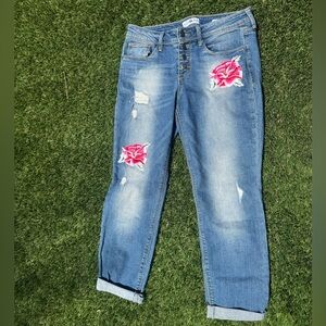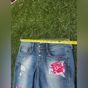 Stylish blue denim jeans featuring vibrant rose embroidery. Perfect for adding a touch of elegance to your casual wardrobe.