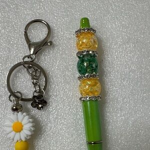 🌼 Daisy Charm Keychain & Beaded Pen Set – 4 Refills Included!