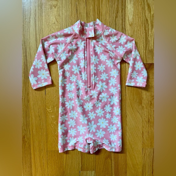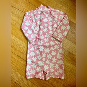 Keep your child protected and stylish with this charming pink rashguard featuring a delightful daisy pattern. Perfect for beach or pool days. Includes a white sun hat.