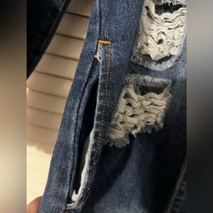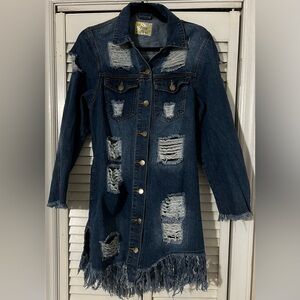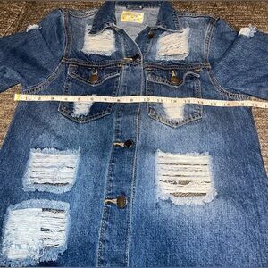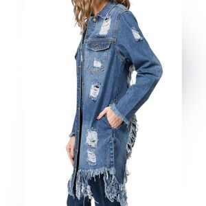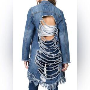 Switch up your style and swap your basic jean jacket for this stylishly long denim jacket. The perfect jacket to throw on and complete any look. This trendy jacket features a distressed threadbare design to further complement the slashed back.