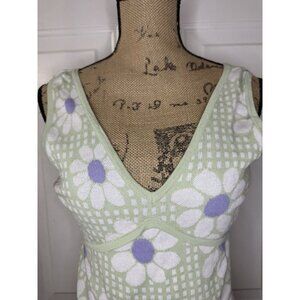 Daisy Floral Printed Sweater Vest Vneck Green Purple LARGE Retro Preppy Cottage