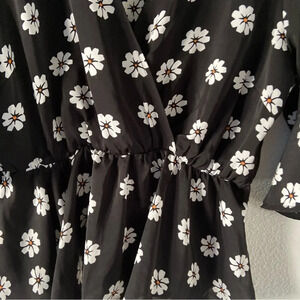• features relaxed silhouette, V-neckline, wrap design, daisy print throughout, elasticized waist, drop sleeves, and ruffled edges.