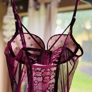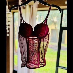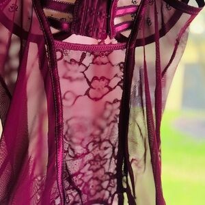 Size small gently used sheer and lace maroon Daisy Fuentes baby doll. Garder belt is not included but the loops are there if you want to add one. All items are washed.