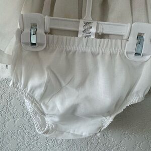 Adorable baby dress with colorful floral embroidery. Features a matching bow.