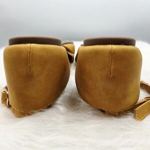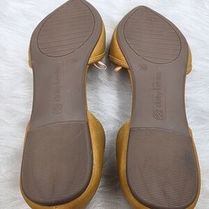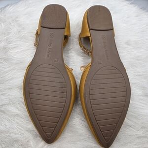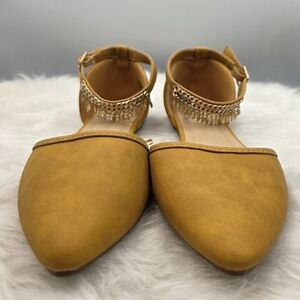 These Daisy Fuentes pointed-toe flats are a must-have for your shoe collection! The stylish mustard yellow faux suede is accented with a delicate gold chain and leaf charm detail, adding a touch of elegance to any outfit.