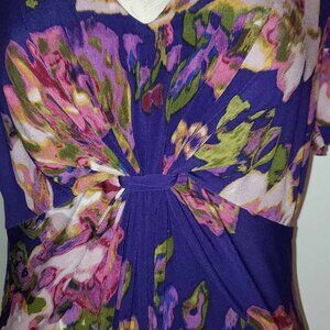 This gorgeous stretch blouse is from Daisy Fuentes. Flutter sleeves. Floral print. V-Neck. Gathered in the front. Straight hem.